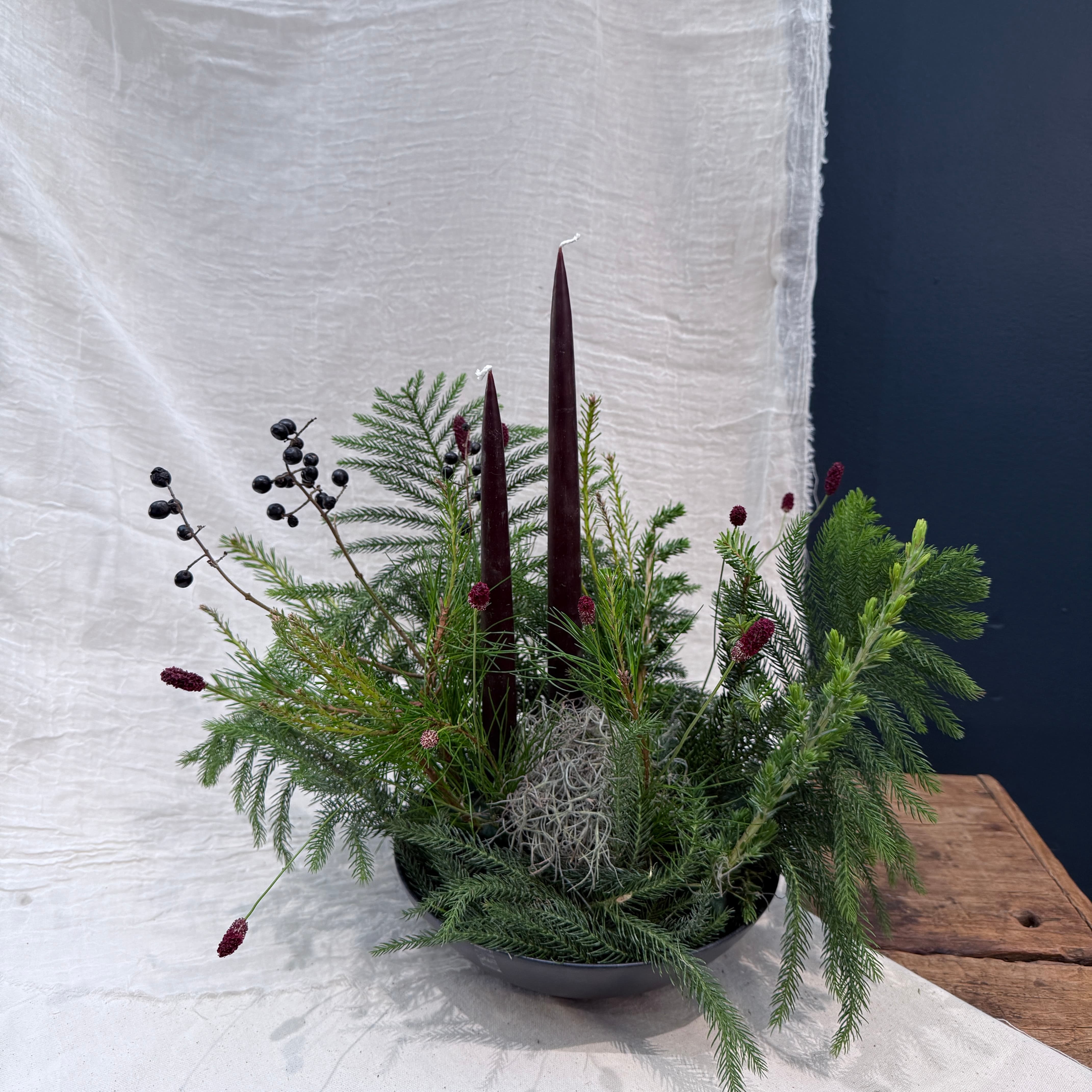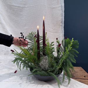 Featuring two chocolate-toned candles, complemented by Norfolk pine, winter pine, and soft moss. Earthy, modern, and crafted to pair seamlessly with our Everglow pedestal design.