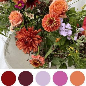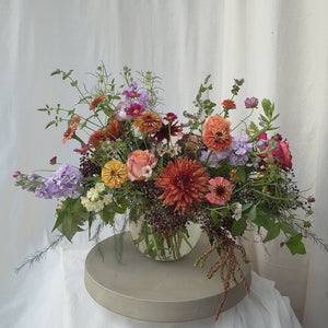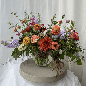 The Autumn Waltz Vase arrangement is designed in a simple glass vase in daydreamy Bloomfields style. Our designers' selection of blooms, accents, and foliage in light and drifty hues of vintage pink, peach, lavender, and orange is a classic choice for all occasions.