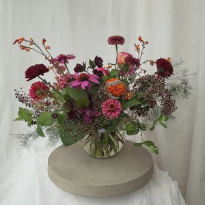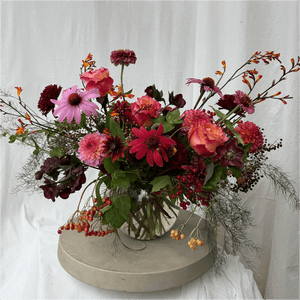 The Crimson Harvest Vase arrangement is designed in a simple glass vase in daydreamy Bloomfields style. Our designers' selection of blooms, accents, and foliage in light and drifty hues of vintage peach and pink, dark burgundy, and orange is a classic choice for all occasions.