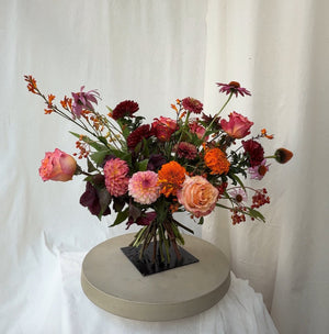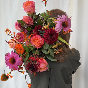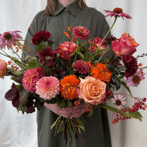 The Crimson Harvest hand-tied bouquet features a stunning selection of blooms, accents, and foliage in soft hues of vintage peach and pink, dark burgundy, and orange. A thoughtful gift for all occasions. You may select an optional simple glass vase to be included with all hand-tied bouquets. Ribbon sold separately.