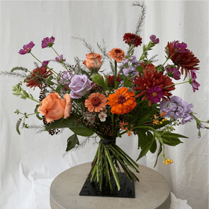 The Autumn Waltz hand-tied bouquet features a stunning selection of blooms, accents, and foliage in soft hues of vintage pink, peach, lavender, and orange. A thoughtful gift for all occasions. You may select an optional simple glass vase to be included with all hand-tied bouquets. Ribbon sold separately.