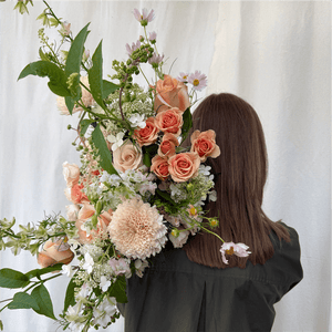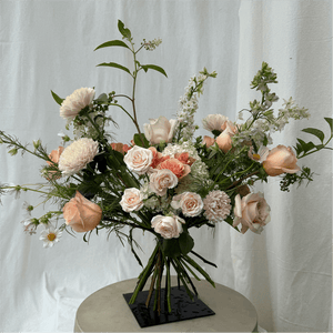 The Poetic Blush hand-tied bouquet features a stunning selection of blooms, accents, and foliage in soft hues of vintage pink, light peach, and blush. A thoughtful gift for all occasions. You may select an optional simple glass vase to be included with all hand-tied bouquets. Ribbon sold separately.