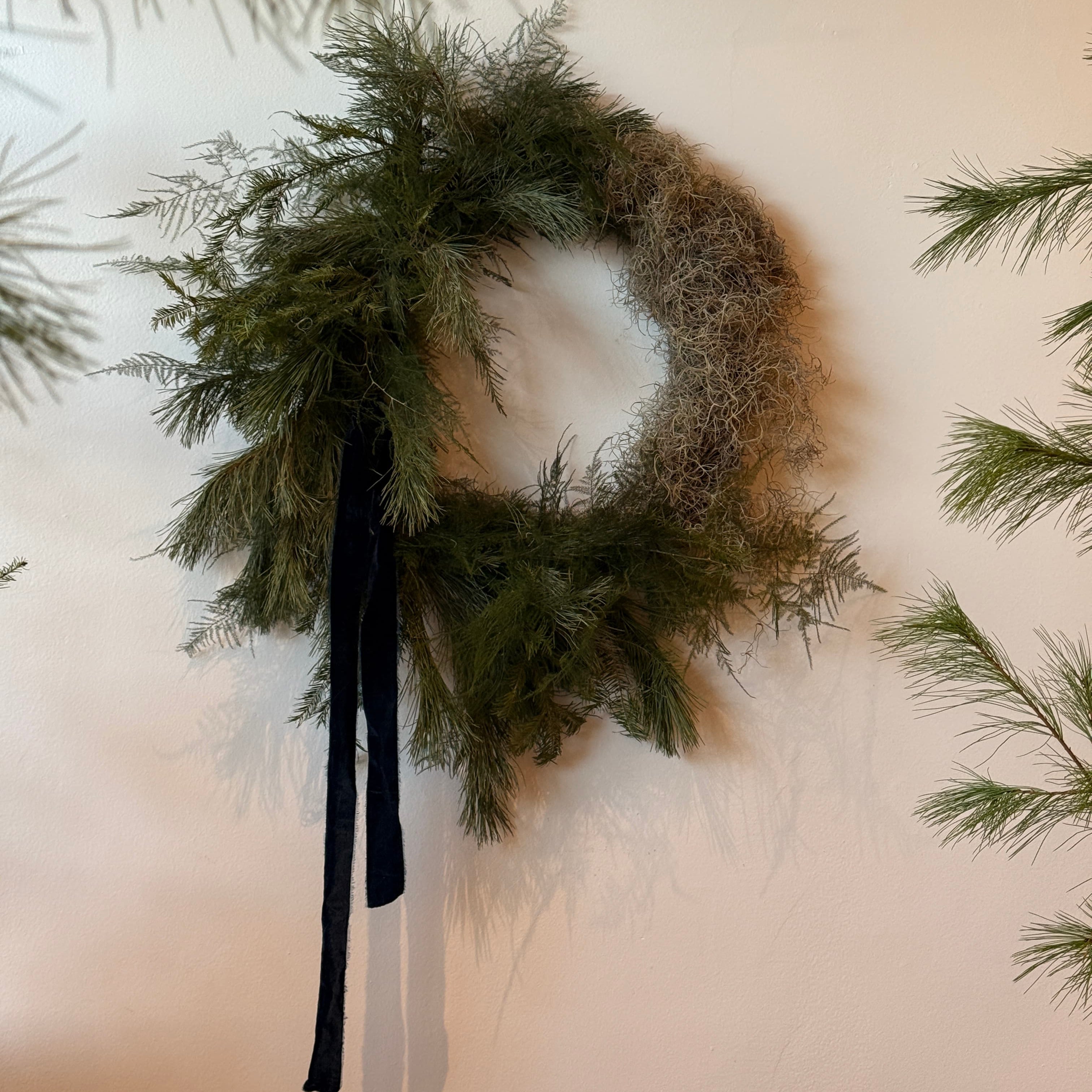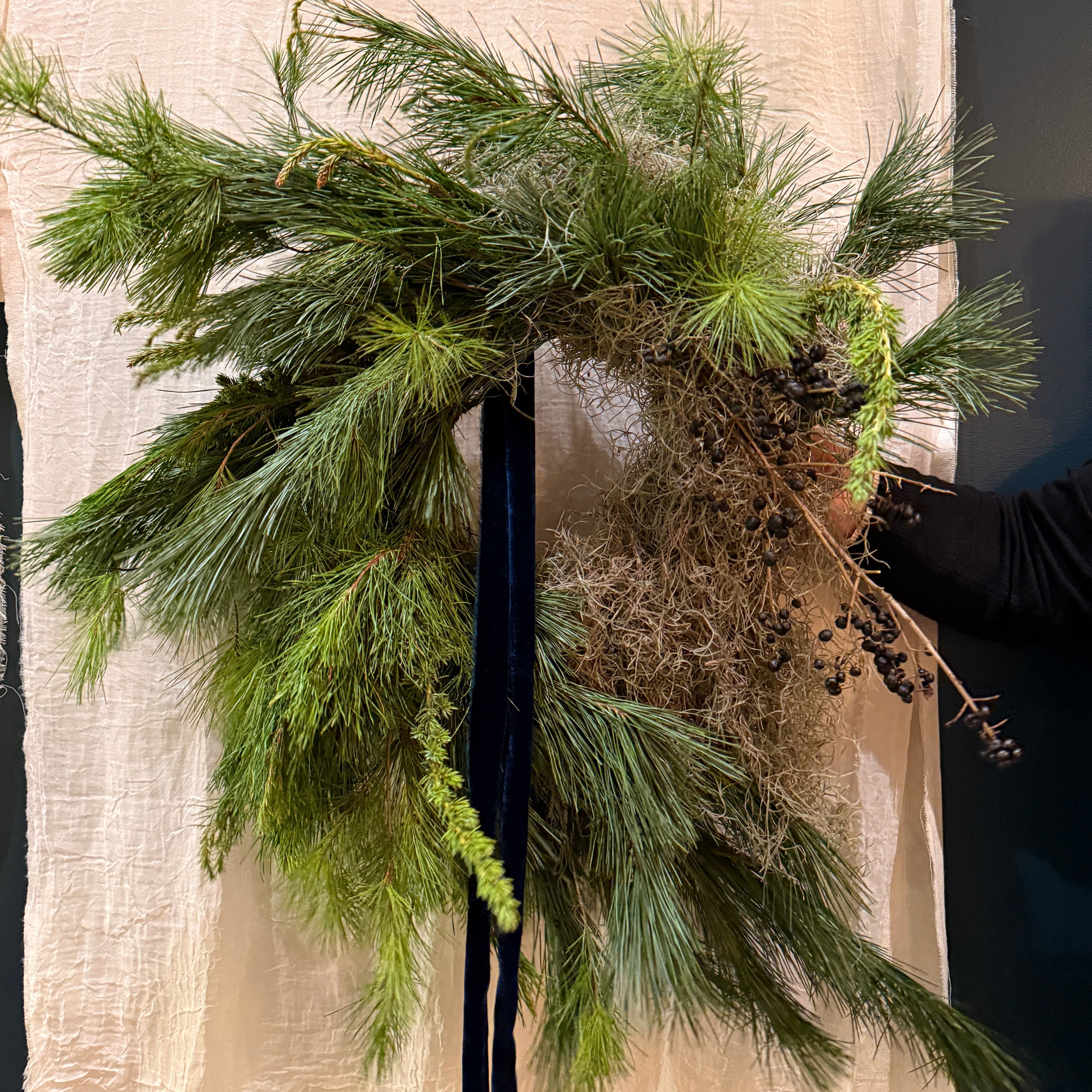 A lush, textural wreath featuring Spanish moss, wintergreens, and natural forest elements.