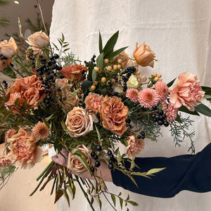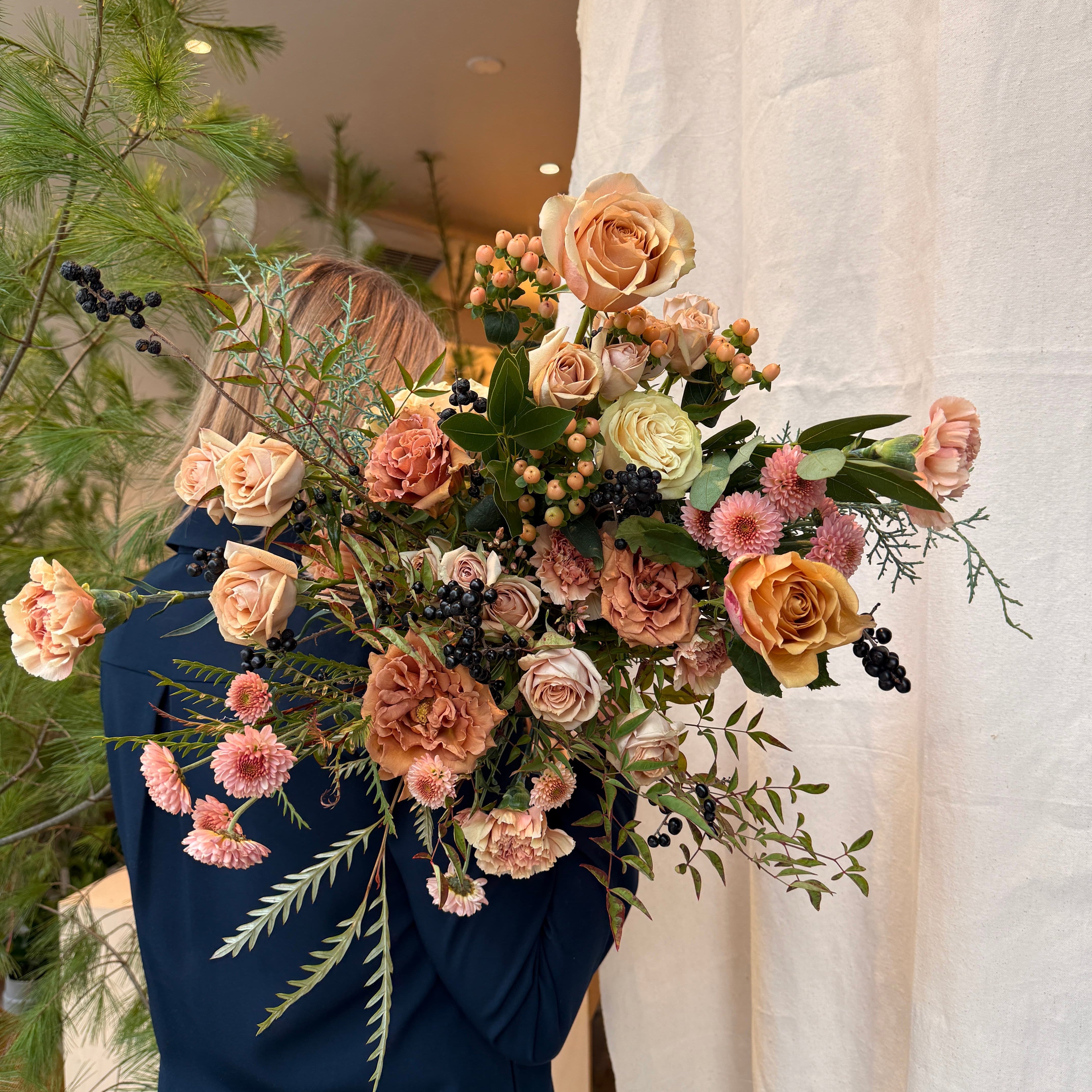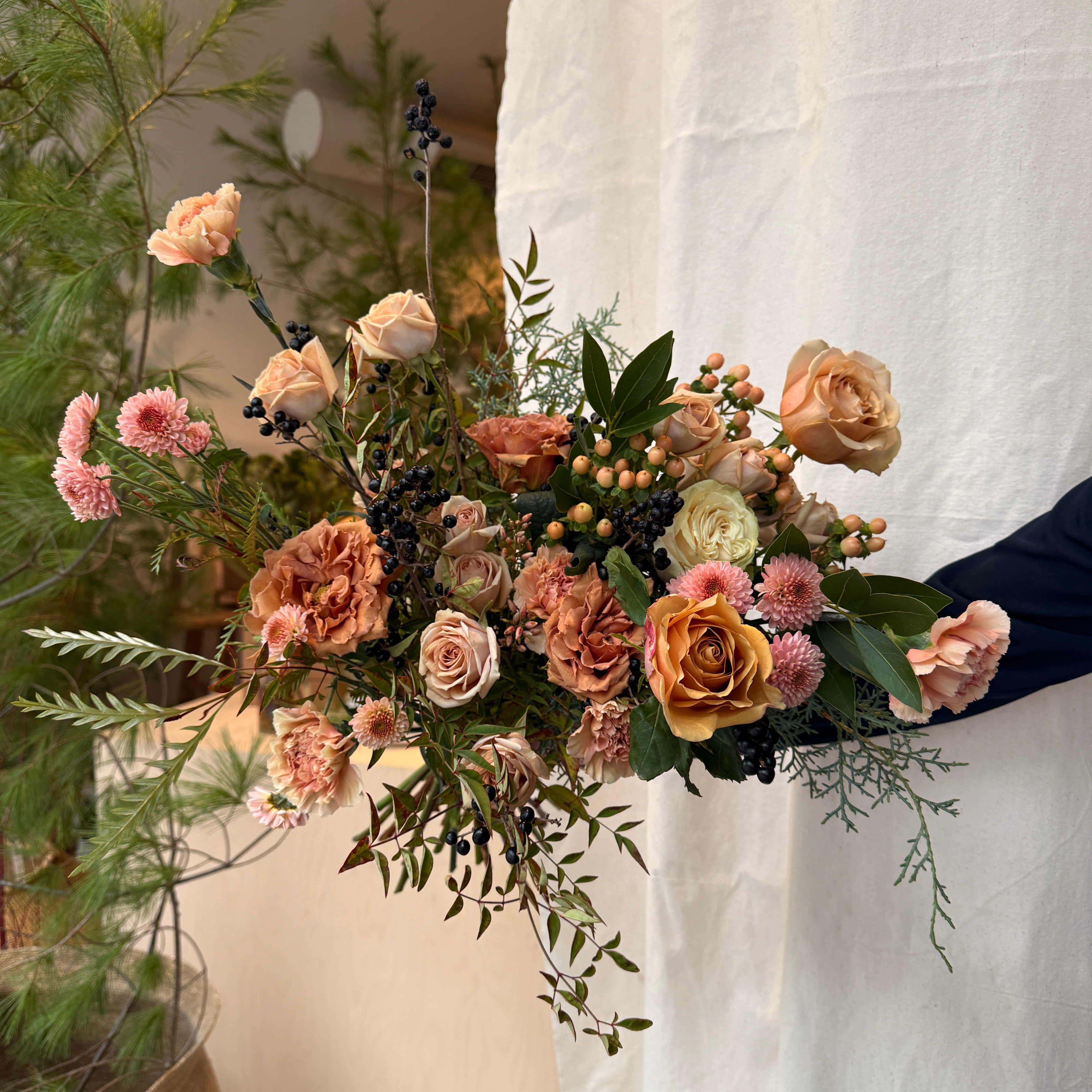 Soft and timeless, Amber Stillness captures the quiet warmth of late autumn. Blush and caramel roses mingle with textured greens and deep berries, evoking the calm beauty of a November afternoon.