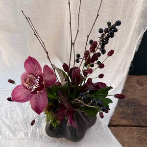 A warm, minimalist design arranged in a large dark brown vase, featuring natural seasonal textures with helleborus as the focal bloom.