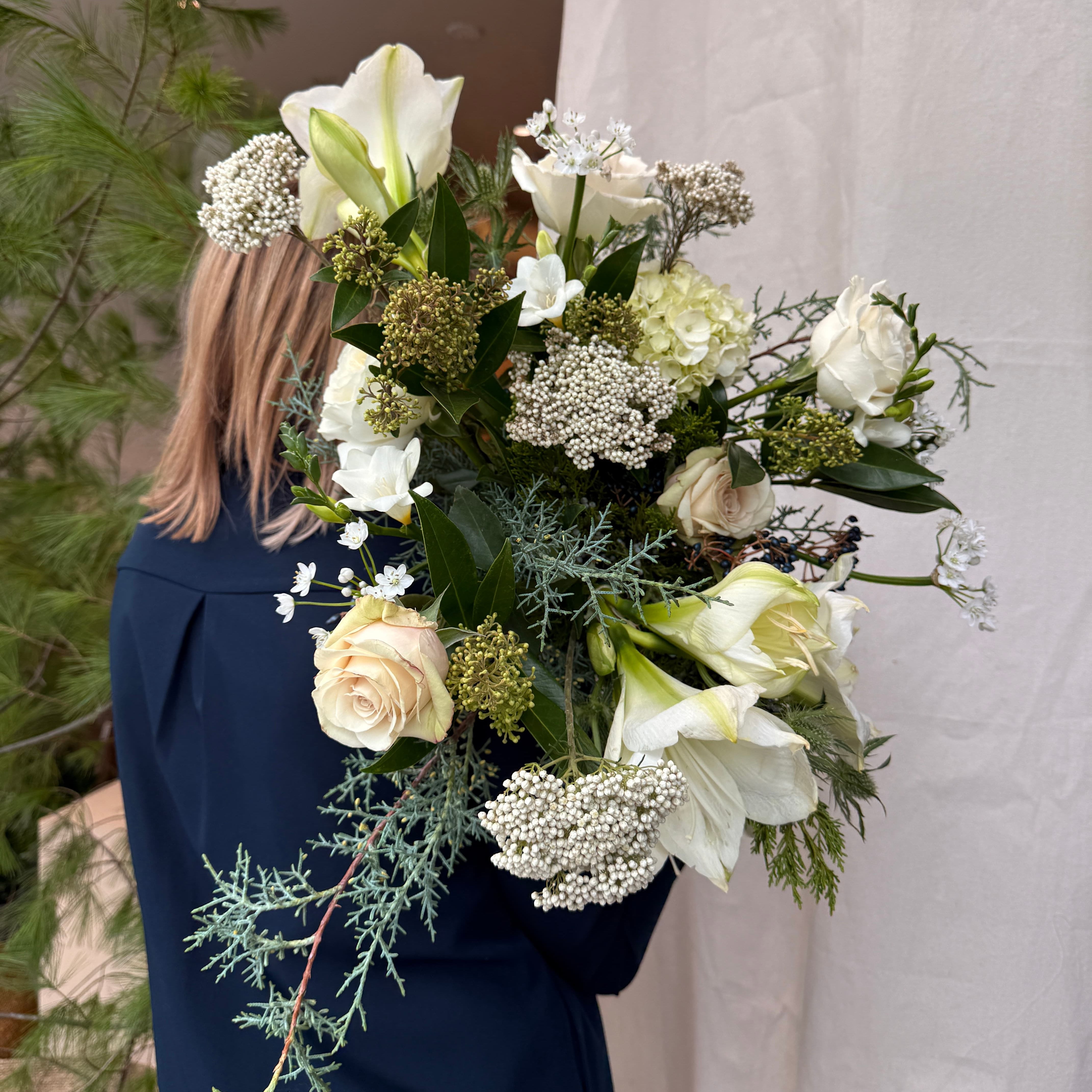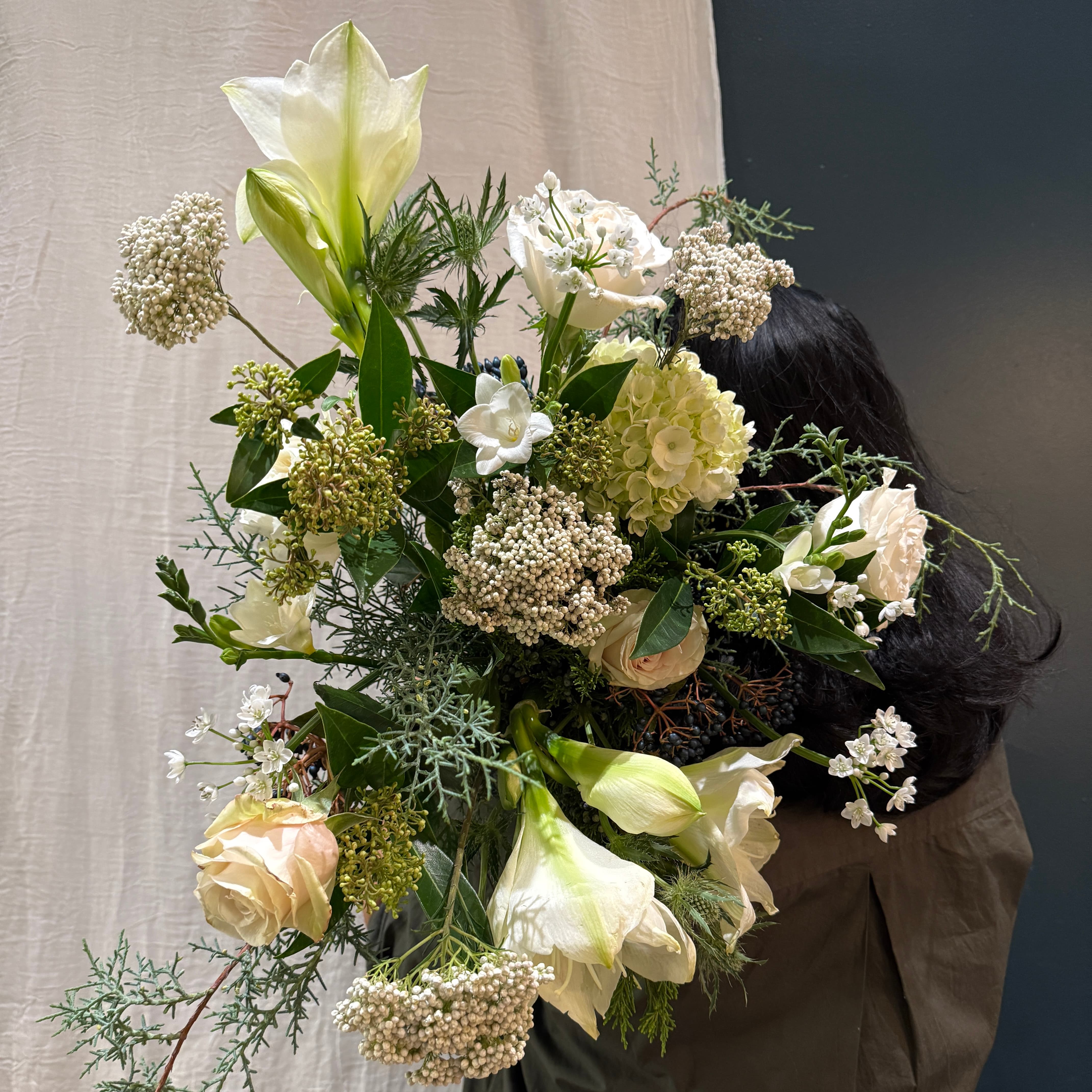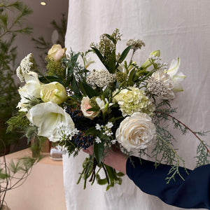 An airy winter bouquet in whites, greens, and soft blue accents.