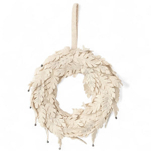 Handmade from soft wool felt, this 12" round wreath features layered cream-colored leaves accented with delicate metal jingle bells. Its neutral palette makes it versatile for seasonal decorating, whether displayed on doors, walls, or as part of a festive table arrangement.