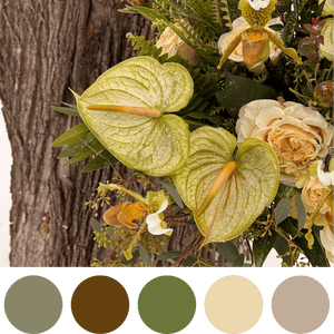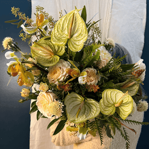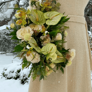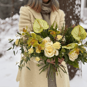 A celebration of warmth in the heart of winter. Cream roses, green anthuriums, and layered textures create a design that feels grounded and inviting — like candlelight glowing through a cold evening.
