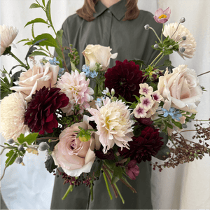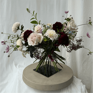The Blush & Velvet hand-tied bouquet features a stunning selection of blooms, accents, and foliage in soft hues of blush, dark burgundy, and a small touch of blue. A thoughtful gift for all occasions. You may select an optional simple glass vase to be included with all hand-tied bouquets. Ribbon sold separately.