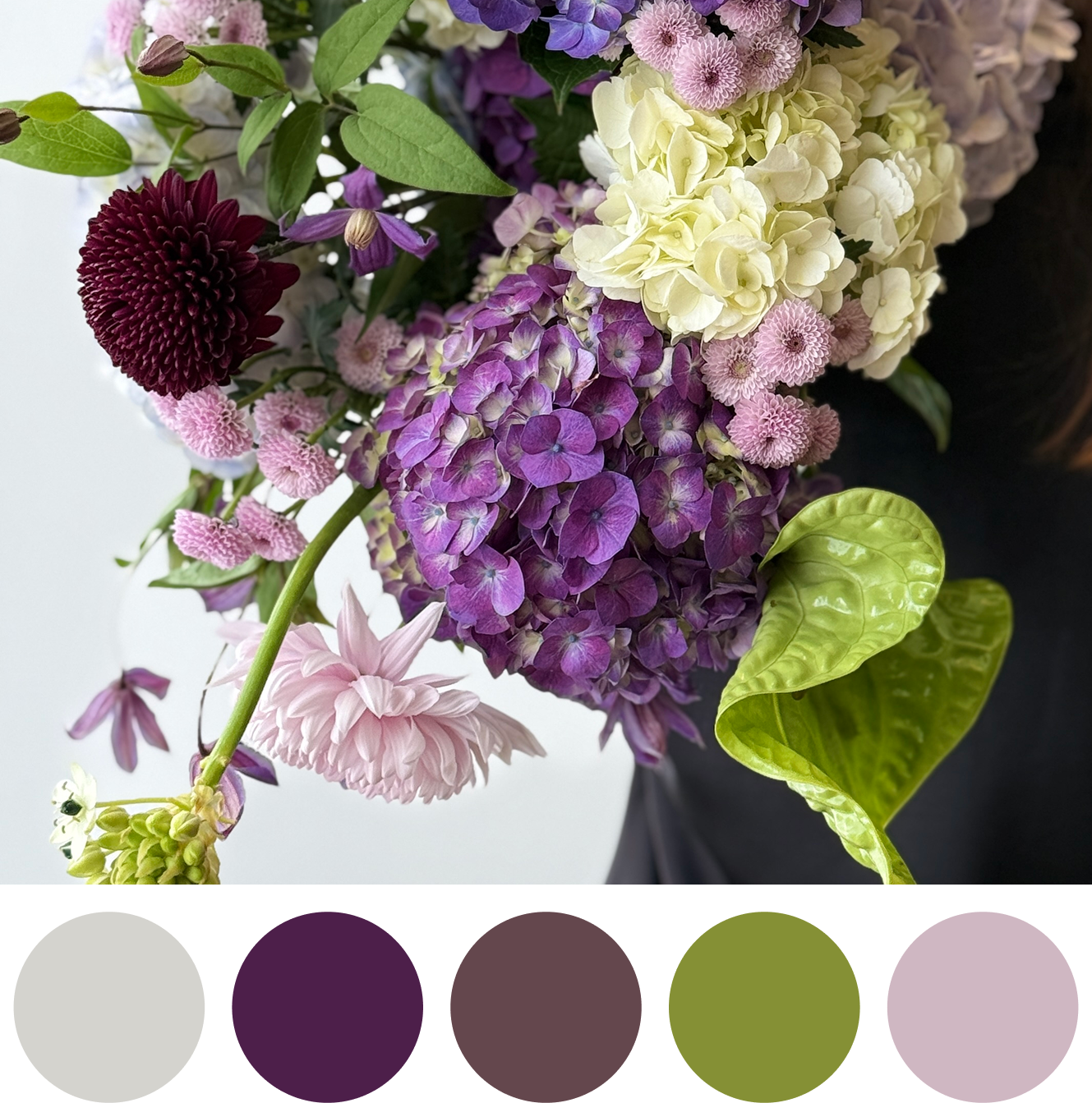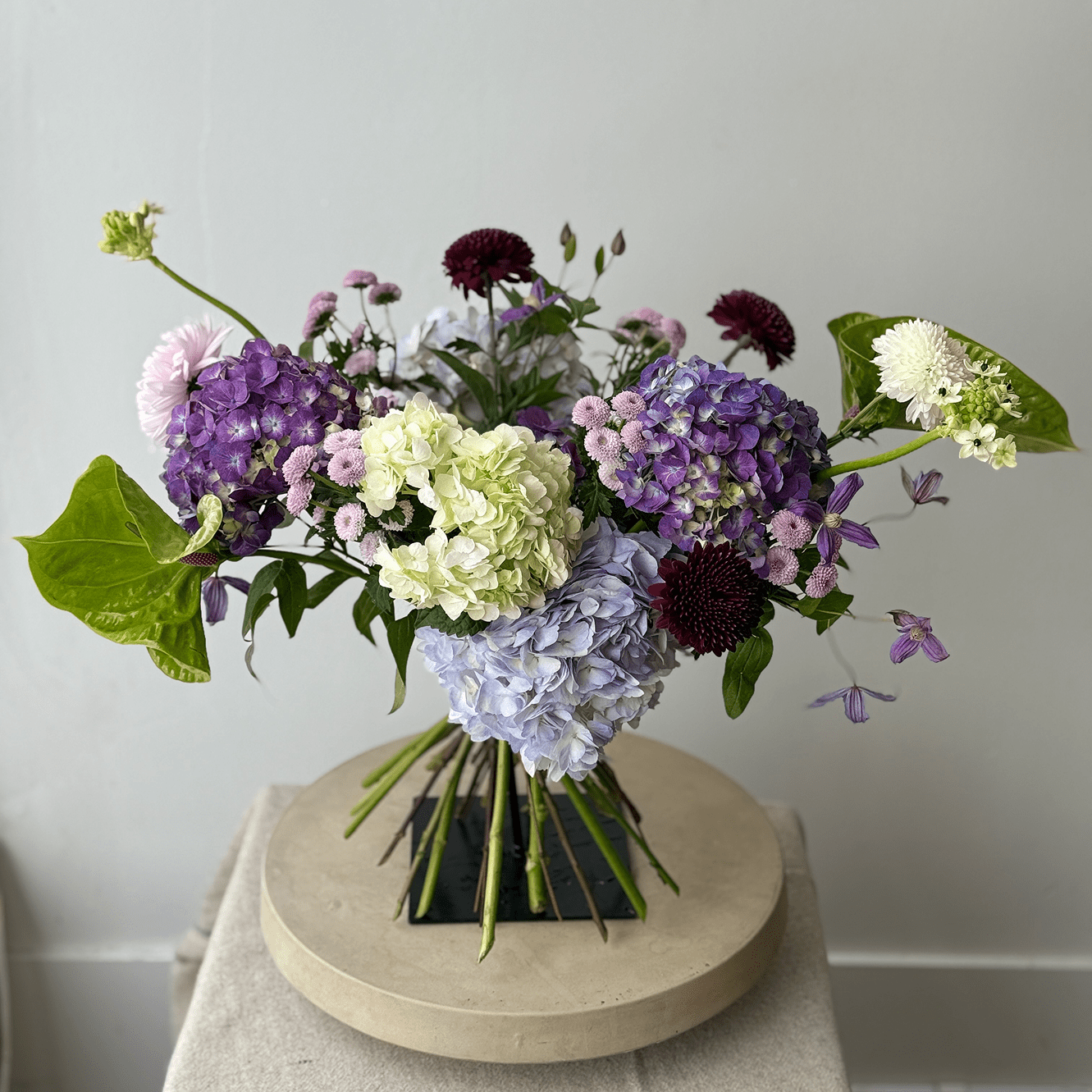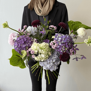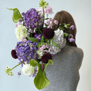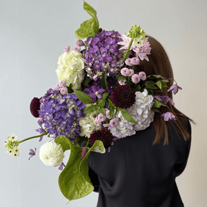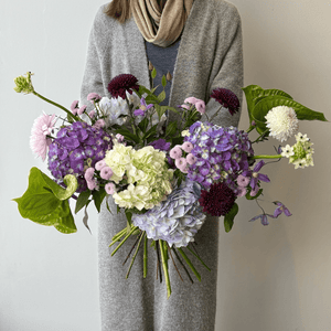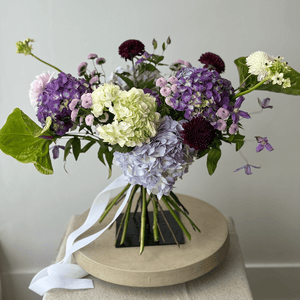 A refined bouquet in soft lavender, creamy white, and deep plum tones. Darling Violet speaks of love that is felt deeply but expressed gently — calm, thoughtful, and enduring. Layered textures and subtle movement create an intimate arrangement with a quiet, elegant presence.
