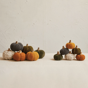 It features a round pumpkin shape with a soft, textured bouclé/velvet cover and a natural wood stem.
