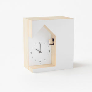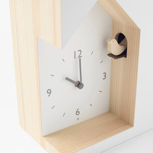 A cuckoo clock with a dent which looks as if the traditional clock has been carved out of the block. The cuckoo bird peeks out sideways from a small hole on the side of the clock. An intelligent light sensor built into the clock will automatically turn off the cuckoo’s movement when it is dark so as not to disturb you at night. She will then wake you up as the morning sunlight enters your room. Made by Japanese designer Yuichi Nara.
