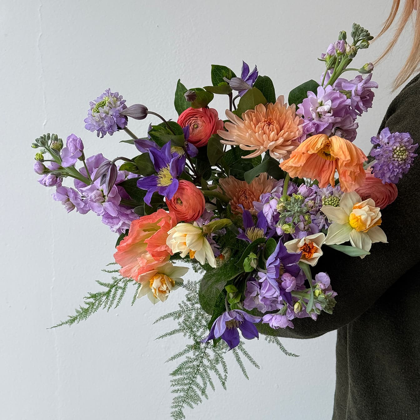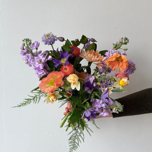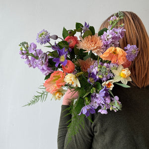 The Symphony hand-tied bouquet features a stunning selection of blooms, accents, and foliage in a fresh palette of peach, purple, and cream. A thoughtful gift for all occasions.