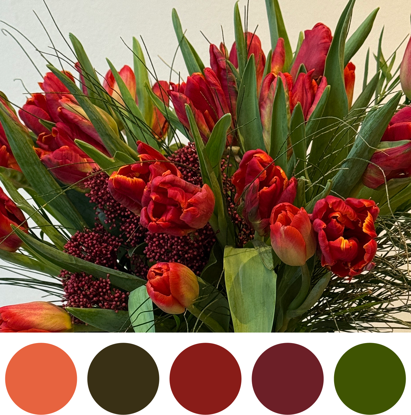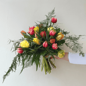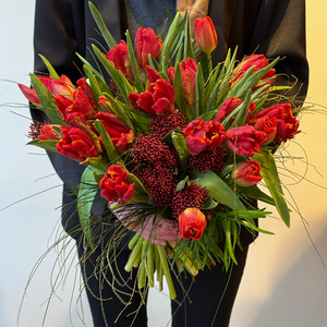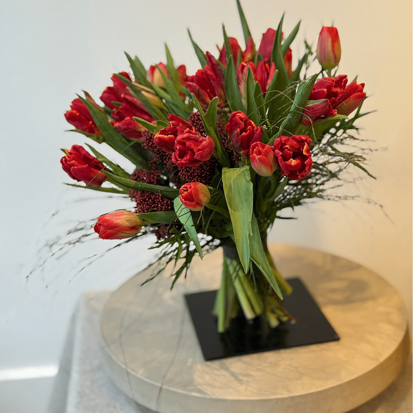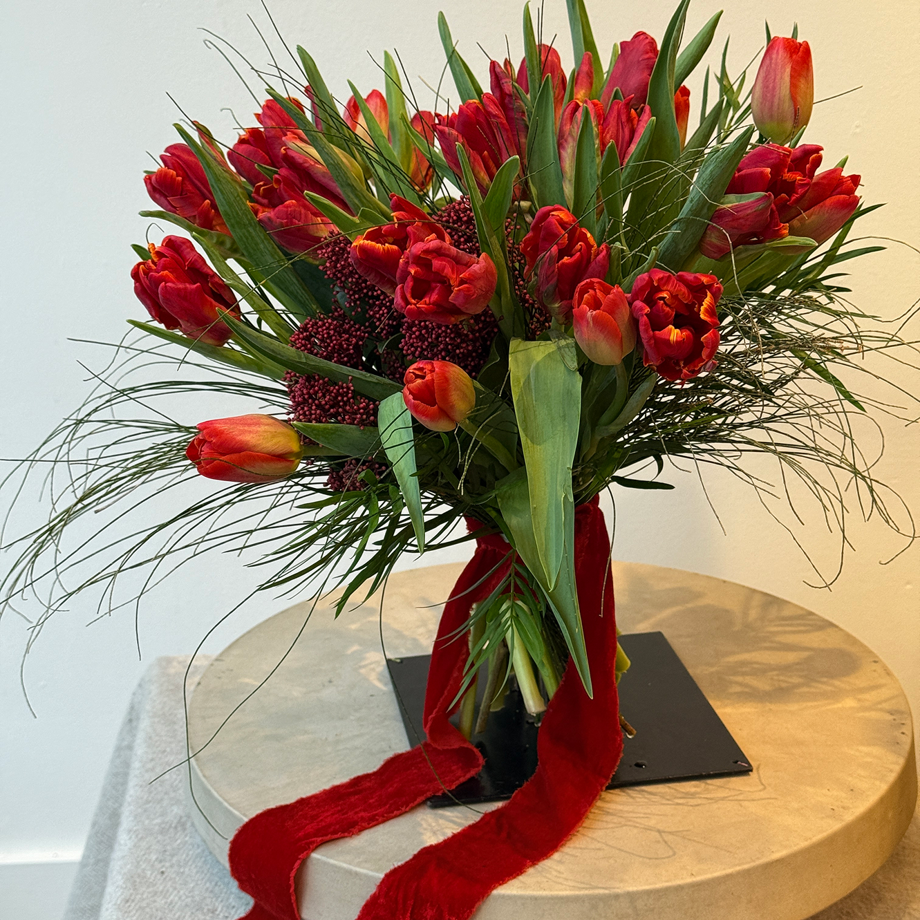 A darling composition of tulips, greenery, and accents available in red or a seasonal mix - a celebration of everlasting love.